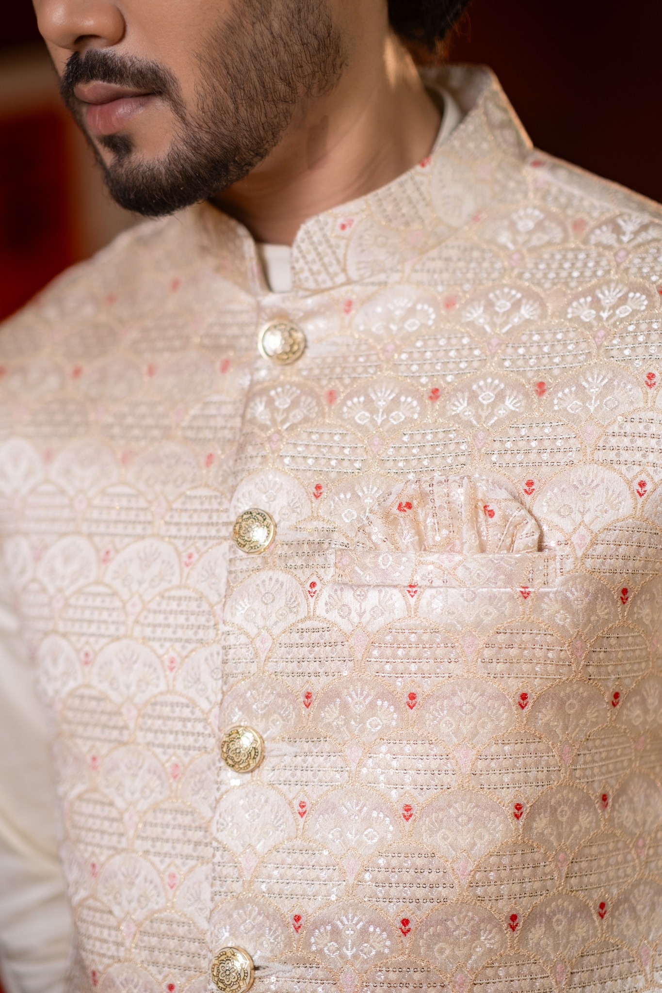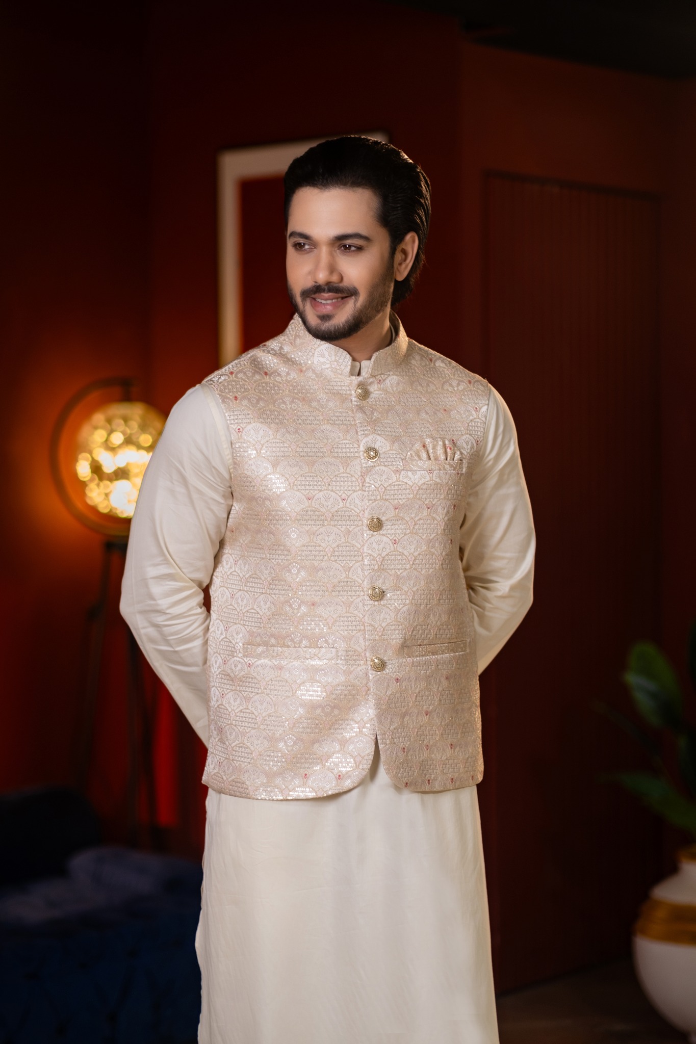 Crafted with refined detailing and a regal sensibility, this Ethnic Koti embodies the timeless elegance of Bengali tradition. Designed to elevate festive and formal ensembles, it features a structured silhouette with premium fabric that offers both comfort and sophistication. Intricate finishes and thoughtful tailoring make it an ideal layer over panjabi or kurta, adding depth and distinction to your look. Perfect for weddings, celebrations, and special occasions where heritage meets modern refinement.
