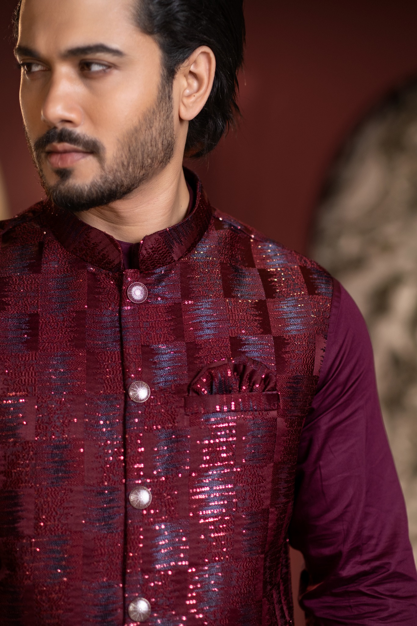 Crafted with refined detailing and a regal sensibility, this Ethnic Koti embodies the timeless elegance of Bengali tradition. Designed to elevate festive and formal ensembles, it features a structured silhouette with premium fabric that offers both comfort and sophistication. Intricate finishes and thoughtful tailoring make it an ideal layer over panjabi or kurta, adding depth and distinction to your look. Perfect for weddings, celebrations, and special occasions where heritage meets modern refinement.